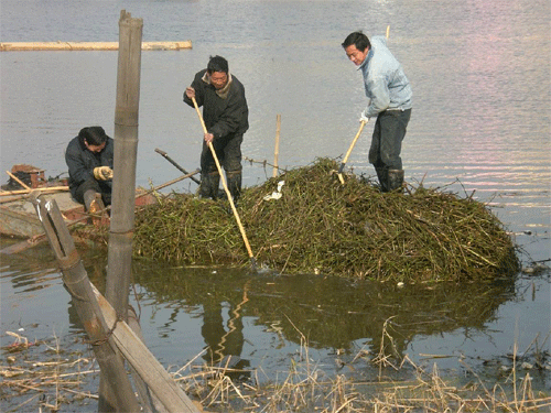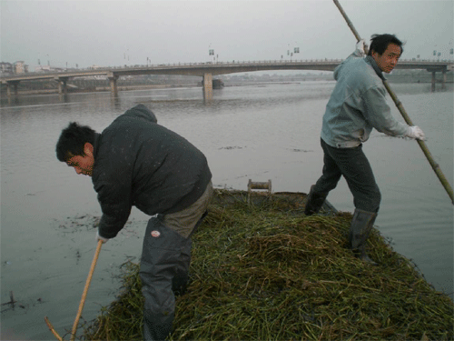 涡河亳州市城区段浮草是芦苇清除后留下的杂草,为迎接即将到来的检查,提高涡河治理的形象,市水务局明确要求杂草必须清除,由于打捞作业本身的难度,市局给予了大力的支持和帮助。