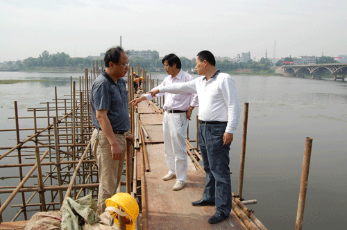 2009年5月31日,公司李世龙总经理、刘朝发副总经理、工程部李立柱经理、办公室纪爱国主任等到公司承建的泉河大桥检查工作。 临泉县泉河大桥重建工程包括临时交通便道便桥工程、老桥拆除工程、引道拆除工程、新建泉河大桥工程和引道工程,总工期260天。李总要求工程项目部一如既往地严格按照工程质量要求,安全施工,特别是当前处于汛期,要注意人员安全,搞好安全生产预案,加强安全监督,责任到人,不断推动工程顺利进展。