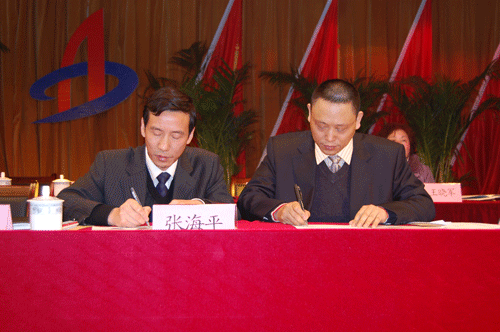 公司党委书记李世龙与集团公司党委书记张海平(左一)签订2010年党委目标考核责任书