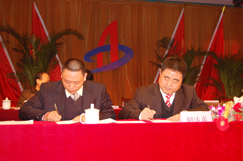 公司李世龙总经理与集团董事长胡运成(右一)签订2010年经营、安全目标考核责任书