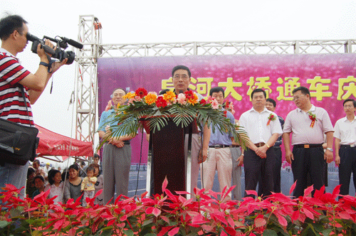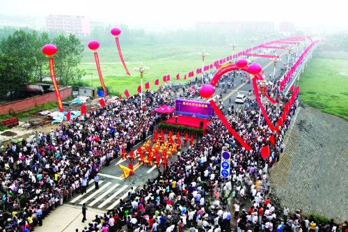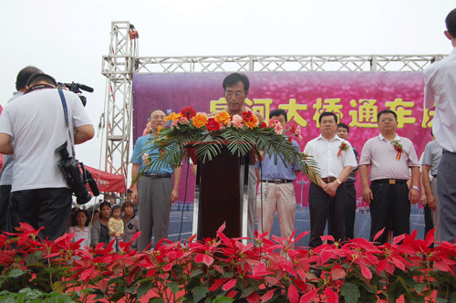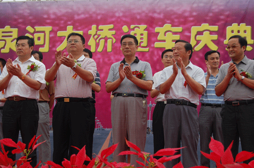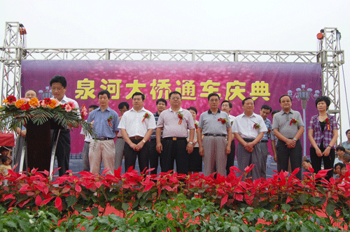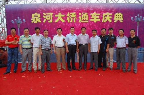 2010年9月6日上午,泉河大桥上彩旗飘飘,锣鼓喧天,人潮涌动,由我公司承建的泉河大桥通车典礼仪式隆重举行,临泉县委、县政府、人大、政协等相关方面领导,安徽建工集团有限公司纪委书记、工会主席刘振武,我公司党委书记、总经理李世龙,党委副书记、纪委书记曹兴堂等领导参加了通车庆典。