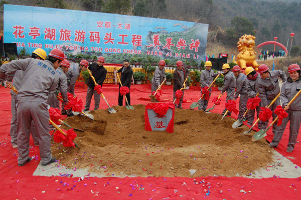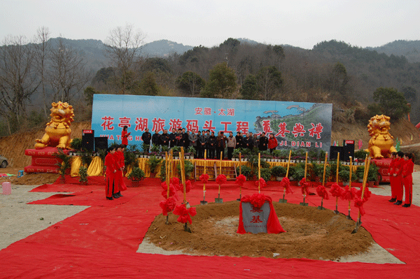 2011年2月22日上午10:18分,我公司承建的太湖县花亭湖旅游码头工程正式开工。省交通运输厅基建处副处长蒲仕光;安庆市政府副秘书长金力力、安庆市旅游局局长刘中汉;中共太湖县委、太湖县人大常委会主任章松;我公司总经理、党委书记李世龙;党委副书记、纪委书记曹兴堂;副总经理刘朝发;项目经理卫邦齐等出席了开工典礼。典礼由太湖县县委常委、县人民政府常务副县长李琳主持。