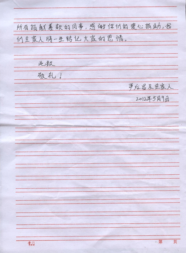 倡议发出后公司领导带头捐款,机关、项目部、工程处职工踊跃捐款,共收到捐款13660元。5月15日下午,公司工会主席王永来代表全体职工把捐款交到严后昌同志女儿手中,体现了公司职工对严后昌同志因病造成家庭困难的关心和关爱,帮助他战胜疾病,渡过难关,愿我们的点滴付出汇成爱心的暖流,让暗淡的生命重新迸发出灿烂的霞光,我们祝愿严后昌同志早日康复!