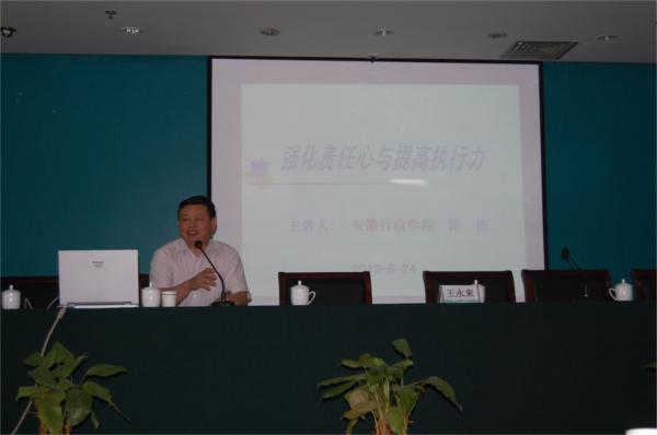 为进一步提高员工的责任心与执行力,培育团队精神,凝聚公司合力,6月25日下午,公司邀请安徽行政学院郭伟教授进行了“强化责任心与提高执行力”的专题讲座,公司党委及班子成员、纪委成员、党支部书记、项目经理、项目技术负责人、工程处负责人及机关全体员工参加了培训。