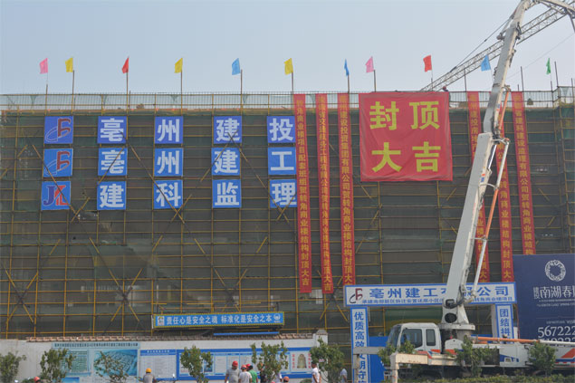 据悉,该工程是亳州建工承建的又一标志性工程,技术含量高,工期紧。自2014年3月1日开工以来,工程项目部认真部署,周密安排,快马加鞭,全力以赴,战酷暑、赶工期,拼进度,最终圆满完成了工程主体封顶的既定目标,得到了各级领导和亳州市质监站的高度评价。该项目主体封顶,对于亳州城市建设环境优化,亳州建工综合施工能力的提升,必将起到积极的推动作用。