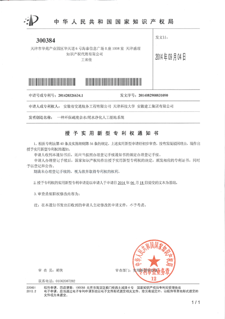 近日,国家知识产权总局专利管理司传来喜讯,我公司获得两项实用新型专利授权,《一种环保疏浚底泥一体化机械深度干化系统》,专利号:201420294523.7,《一种环保疏浚余水/尾水净化人工湿地系统》,专利号:201420326634.1,这是公司重视“科技兴企”战略的重要成果,实现了公司在专利申请方面零的突破,同时为提高公司技术能力和深入实施“科教兴企”战略打下了坚实的基础。