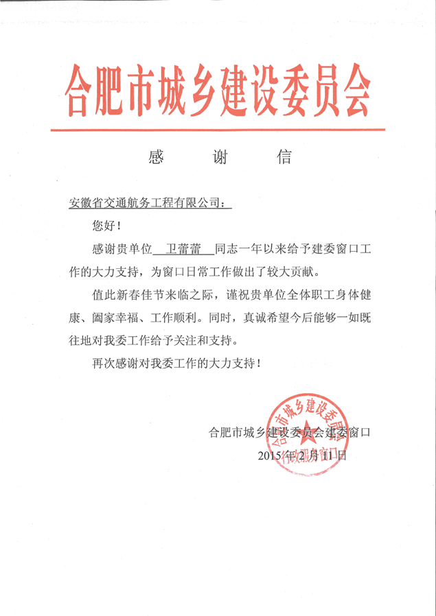 2014年9月,因合肥市建委工作需要,卫蕾蕾同志被公司推荐、建委考核,借调至合肥市城乡建设委员会窗口工作,协助处领导主要负责全市工程勘察、设计、施工,以及设计与施工一体化资质管理工作及常规性的参加有关勘察、设计、一体化、施工等专业资质审查工作等。