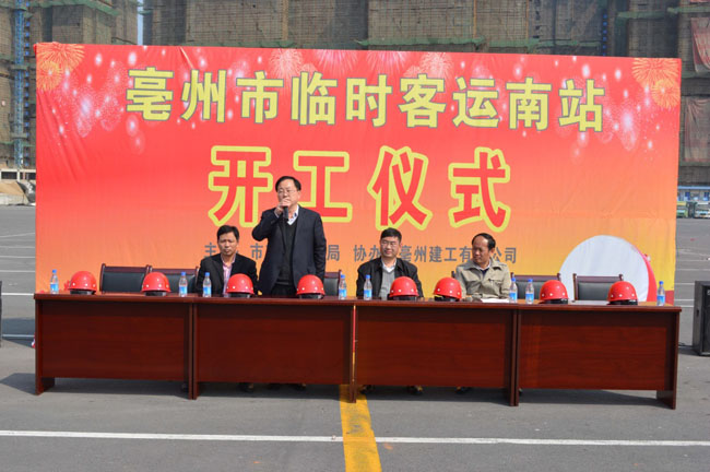 开工典礼由市交通局刘兴群副局长主持,上午10时10分,交通局高川局长宣布项目正式开工。亳州建工董事长李涛代表施工单位致辞,他表示:客运南站临时客运站工程的建设,可以有效地缓解交通秩序,营造畅通和谐的城市环境,是建设“三个亳州”的迫切需要。参与这一重点工程建设,我们深感荣幸和责任重大,为此我们组建了强有力的施工管理班子,选择了精锐的施工队伍,制订了严密的施工计划和扎实的安全防护措施,确保能安全优质高效地建设好该工程,不负政府和人民的所托。