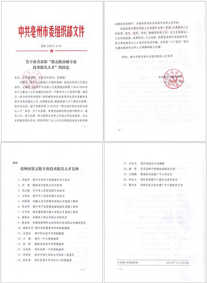 方申柱同志被授予“亳州市第五批专业技术拔尖人才”称号