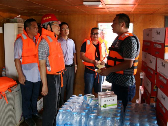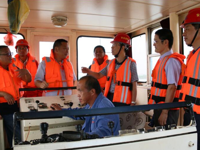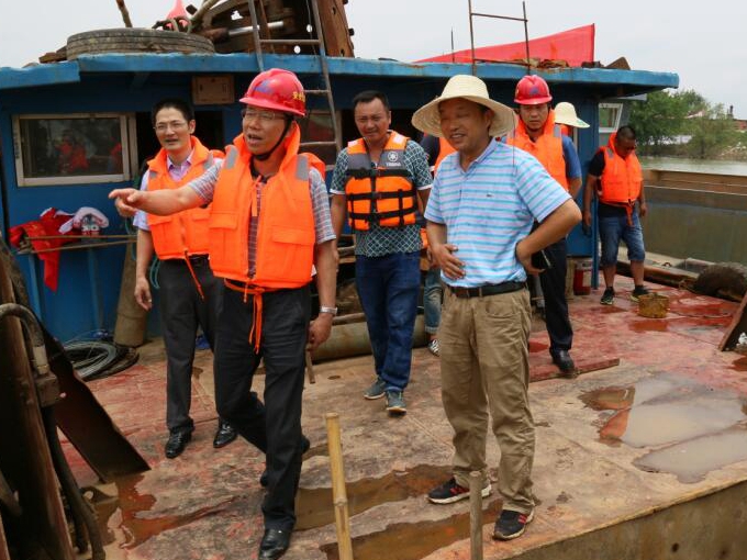 7月14日上午,集团公司副总经理王厚良、安全监察局副主任葛辉在安徽交航公司副总经理方申柱、总经理助理、疏浚分公司总经理董双武的陪同下来到青弋江南陵县四七圩仓溪段堤坝抗洪抢险第一线现场指导抗洪抢险工作。王总一行首先登上正在青弋江河道中进行河道清淤的“蛟龙号”,查看施工作业进度,指导安全度汛工作。他与船员们亲切交谈,详细了解船舶作业原理、了解施工中遇到的难点,指导船员们在施工过程中在安全方面应该注意的事项,嘱咐安徽交航公司要做好船员生活的后勤保障工作。上岸后一行人又驱车赶往南陵县四七圩仓溪段堤坝抗洪抢险第一线,乘坐冲锋舟,登上正在溃堤处进行施工作业的抓斗船。登船后,王总与在船上值守的南陵县水务局局长郑松淼进行亲切交谈。郑局长感谢安徽建工、安徽交航公司对当地政府抗洪救灾给予的大力支持,王总表示抗洪抢险是我们国有企业应当承担的社会责任,是应该的。王总详细查看了船上作业设备询问了施工进度,对辛苦作业的职工们给予鼓励和问候,嘱咐职工们在作业同时要注意自身安全,并送上了慰问品和慰问金。职工们感谢集团领导的关心,并纷纷表示将不辱使命,发扬安徽建工人不怕苦不怕累,勇于拼搏的精神,争取尽早完工,让灾民们早日回到家中。