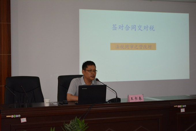 王律师首先讲解了何为法税同审、税收是如何产生的及“营改增”相关基本税收与法律知识,同时数例并举,以鲜活实例阐述了合同的签订对公司税负的直接影响;随后王律师结合建工公司经营实际,着重讲解了“营改增”对建筑行业税负的影响,并对公司的经营管理、税收筹划提出了针对性的意见及建议,特别是对经济合同签订时的涉税条款审查提出了具体的把控要点。最后王律师与各位学员进行了互动交流,对工作中存在的问题作一一解答。