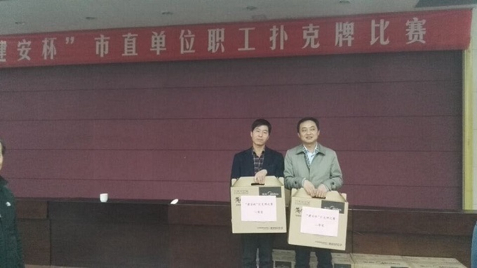 鉴于公司在建安集团“掼蛋比赛”中的出色表现, 11月5日,由亳州市总工会主办,建安集团协办,在市行政会议中心第一会议室组织举办了“建安杯”市直单位职工扑克牌比赛,公司副总经理刘军、材料采购部经理罗以红被推选参加了亳州市市直单位职工扑克比赛,比赛共组织32只参赛队伍,经过紧张、激烈的淘汰赛,公司副总经理刘军、材料采购部经理罗以红获得本次“建安杯”扑克牌比赛二等奖。