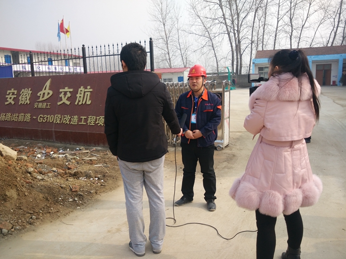 1月11日上午,萧县电视台采访小组到安徽交航萧县萧杨路(站前路-G310段)工程项目经理部施工现场进行新闻采访,就该项目工地标准化建设,施工进展、工程重难点等进行拍摄、采访。项目经理徐鑫接受记者采访,并详细介绍该项目工程概况和目前施工情况。