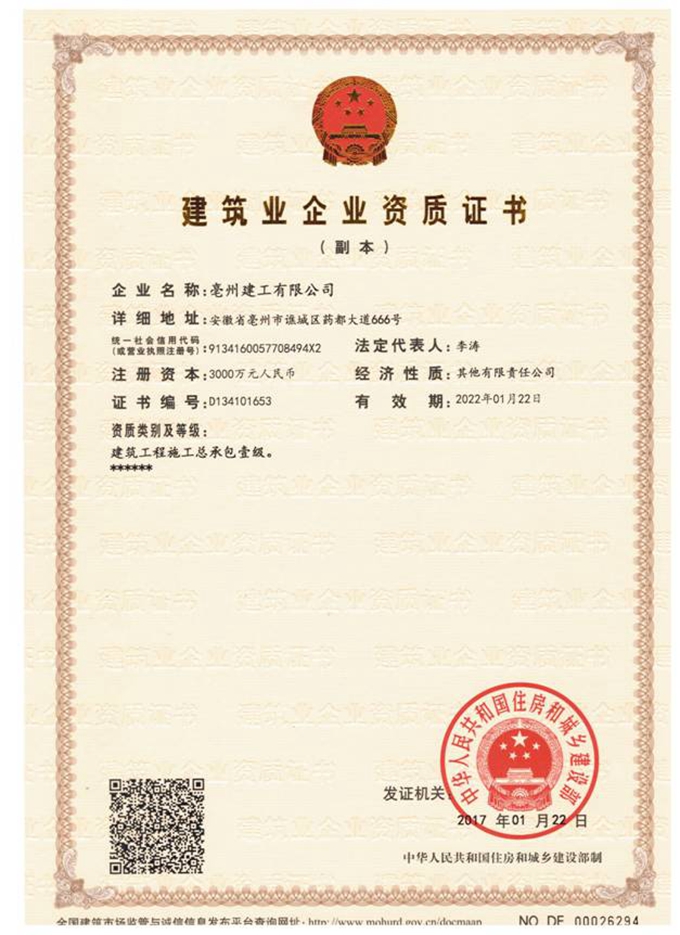 近日,经省住建厅初审、住建部专家认真评审公示公告后,亳州建工有限公司成功晋升“建筑工程施工总承包壹级资质”,实现了企业施工总承包资质水平的提升,为企业实现“十三五规划发展目标”奠定坚实基础。
