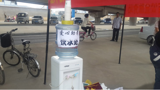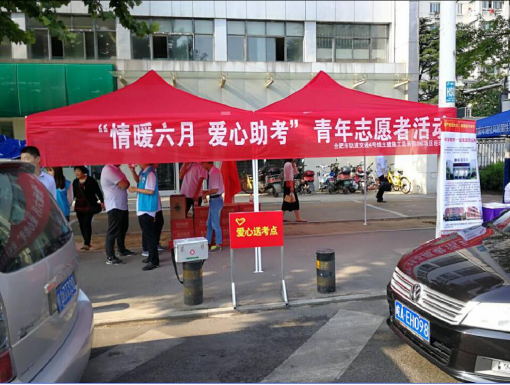 安徽交航合轨4号线3标项目职工在祁门路与金寨路交口设立义工服务站,为考生主动送水、送文具,指导他们乘坐爱心出租车、公交车,对心里紧张的考生进行心理辅导,帮助考生减压。为陪考家长提供座椅、饮用水等服务。同时为考生分发防暑药品。参与爱心助考公益活动的交航公司职工成为高考期间合肥街头一道靓丽的风景线。