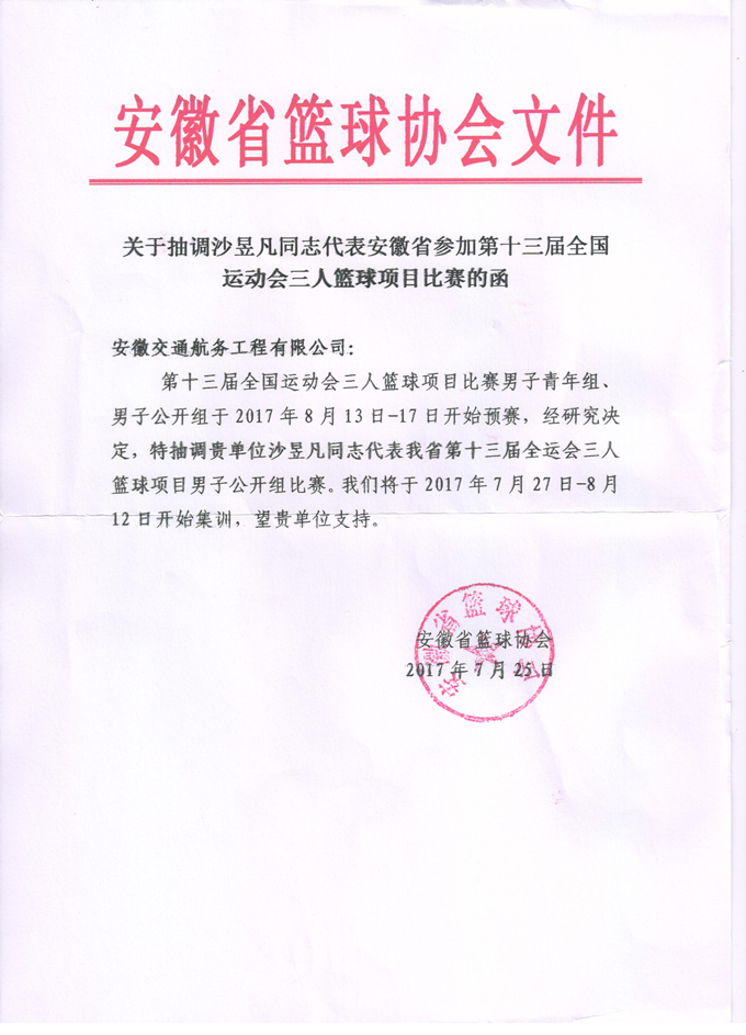 7月25日,安徽省篮球协会向安徽交航公司发函,抽调安徽交航员工沙昱凡代表安徽省参加第十三届全国运动会三人篮球项目比赛。沙昱凡为我公司法务专员,球技精湛,在省内篮球界享有一定知名度。接到此函后,安徽交航领导高度重视,要求公司法务部、人力资源部、工会全力配合省篮协,协调好运动员的工作,保证充足的集训和比赛时间,争取在第十三届全运会上为我省篮球事业争光。