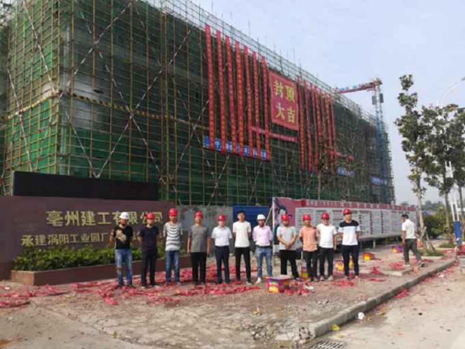 2017年9月21日9点18分,伴随着震耳欲聋的鞭炮和欢呼声,亳州建工涡阳工业园区厂房及综合楼工程A9#仓库顺利封顶。业主单位、监理单位主要负责人及项目部全体成员参加了此次封顶仪式。