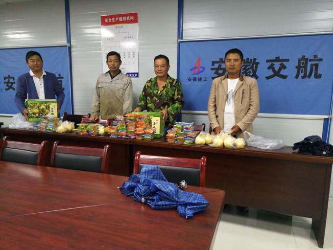 为了让农民工兄弟在工地上过一个幸福温馨的国庆节、中秋节,感受到交航公司带来的温暖,项目部将一盒盒象征团圆的月饼,一箱箱饮料、水果等食品送到节日期间坚守在本职岗位的农民工兄弟手中。慰问品虽简单,但承载了合轨项目部对民工兄弟的祝福与关爱。