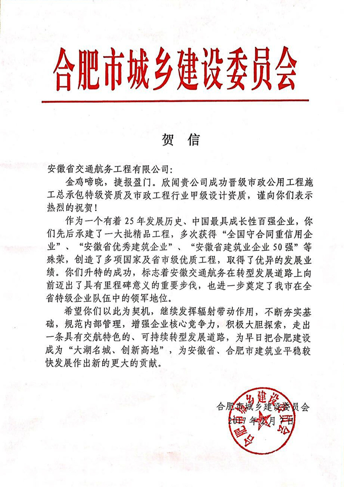 市场准入是企业进行市场经营活动的敲门砖,也见证企业基础建设水平的高低。曾几何时,安徽交航受困于此、受制于此、受限于此,仅凭主项二级资质在如浪淘沙般的激烈市场上匍匐前行、艰难开拓,是为交航全体职工特别是勇于面对困难、敢于突破壁垒的市场经营骄子们的“心痛”。鉴于此,公司党委领导班子审时度势、高瞻远瞩,及时提出资质、注册资本等市场准入建设“三步走”规划:主项提升、“品”字业务资质完善与提升、相关多元完善和提升。功夫不负有心人,千帆过尽不忘初心,企业市场准入建设工作正蹄疾步稳、着力为交航差异化大发展助力贺彩!