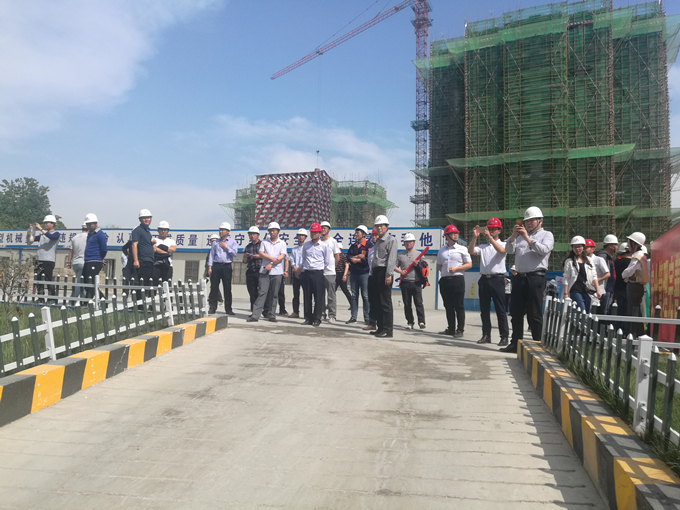 在项目施工现场,对项目的现场部署、标准化建设、工程实体、新技术应用等亮点部位进行观摩学习。项目部负责人向大家详细介绍了项目的标准化建设、新技术和信息化应用、进度管理、成本控制、质量管控、安全文明施工等相关情况,尤其在格构式塔吊基础的利用、无料台施工电梯的设计、盘扣式脚手架的使用、现场循环水的收集再利用、VR安全体验新技术的应用等方面给大家耳目一新的感觉。