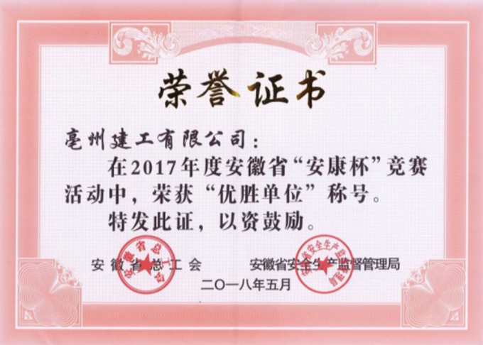 日前,亳州建工被安徽省总工会、安徽省安全生产监督管理局评为2017年度安徽省“安康杯”竞赛优胜单位。