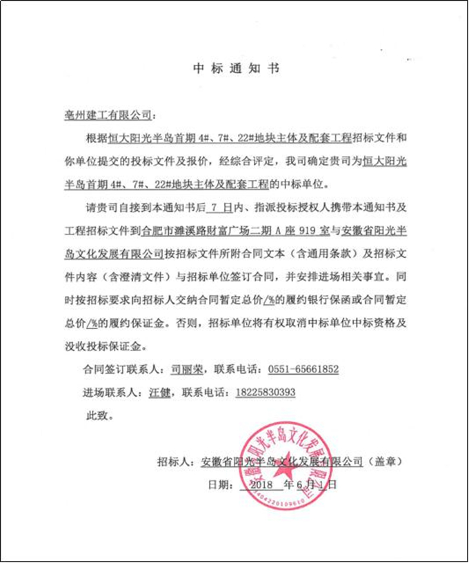 6月1日,亳州建工收到大型知名房企恒大地产集团有限公司匠心打造的旅居巨作——“恒大阳光半岛项目”首期4#、7#、22#地块主体及配套工程中标通知书,中标金额3.6亿元。