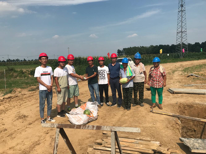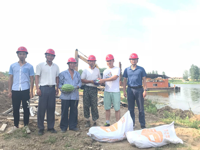 沱浍河项目部领导班子成员前往各施工班组,给正在烈日下作业的一线工人送去西瓜、仁丹、藿香正气水等防暑降温用品,以表示对各个岗位上的一线工人在高温环境工作的关怀。并向他们强调,一定要注意防暑降温,保护好身体,合理排班,杜绝中暑情况发生。