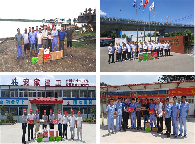 7月19日至8月上旬,公司纪委书记、工会主席李杨,副总经理刘朝发、侯力分别带队前往蒙城、淮北、淮南、黄山、芜湖、合肥等地区慰问了14个项目部、3个船队,为奋战在一线的职工送去防暑降温用品。因船员工作生活条件艰苦,公司工会额外给3个船队配备了急救药箱、健身器材。
