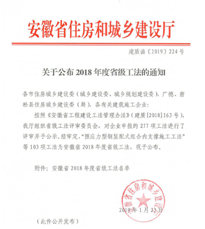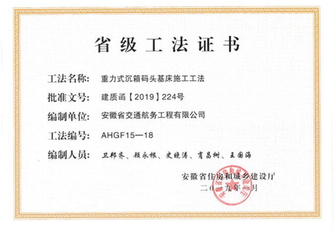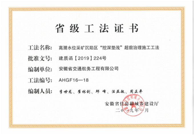 根据《关于公布2018年度省级工法的通知》(建质函【2019】224号),公司组织编制的《高潜水位采矿沉陷区“挖深垫浅”超前治理施工工法》和《重力式沉箱码头基床施工工法》获得2018年度省级工法。