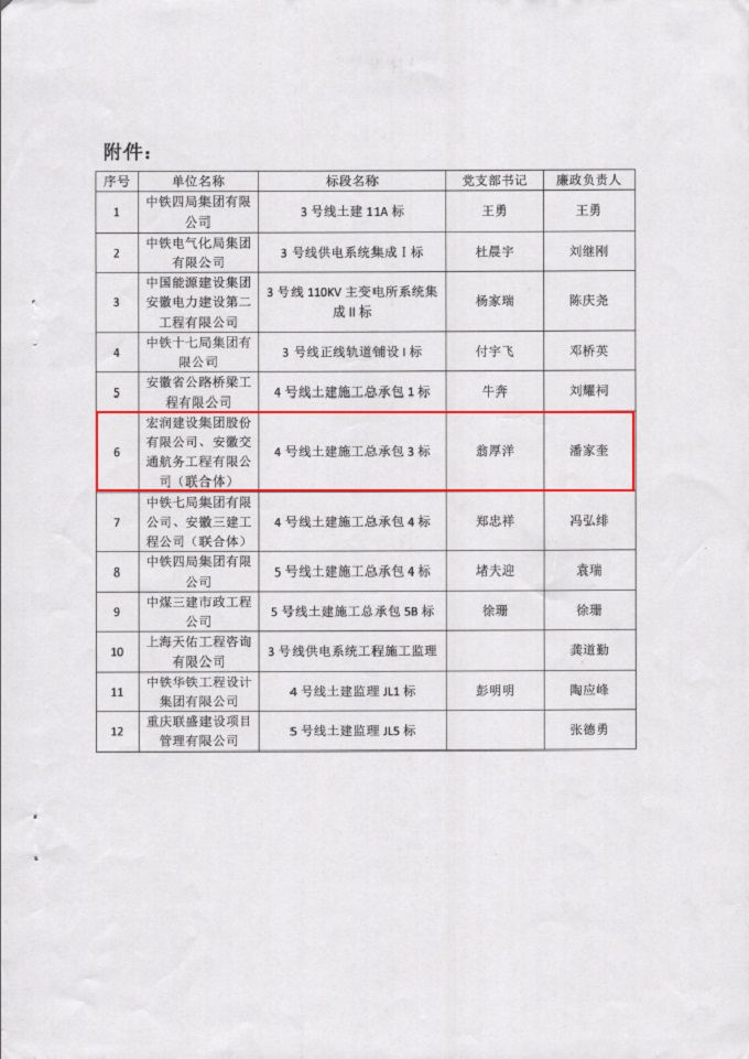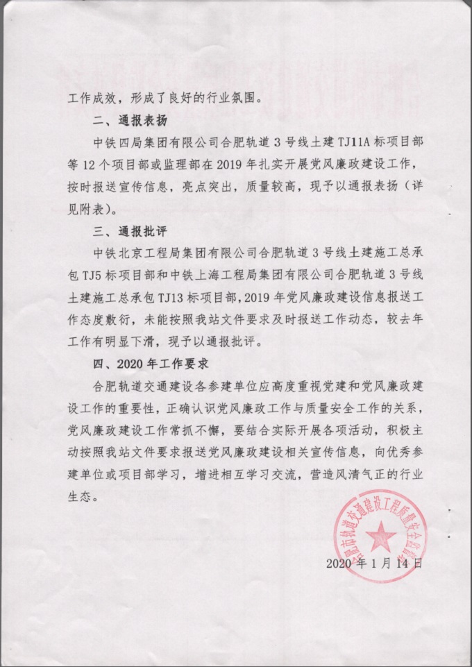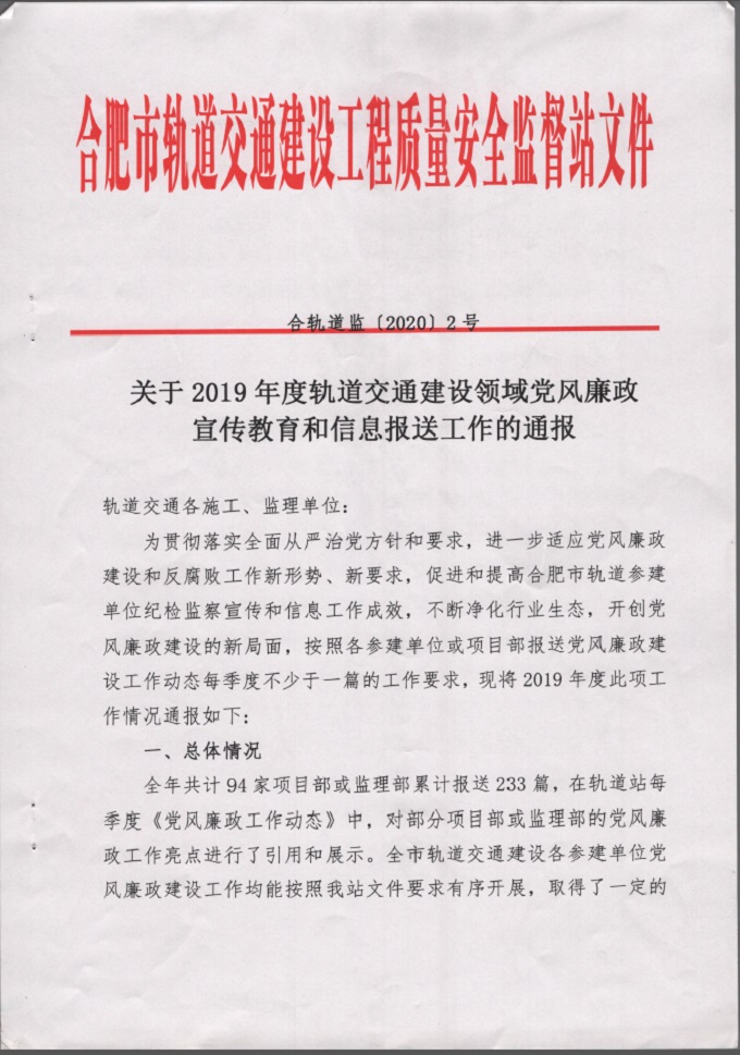 近日,市城乡建设局轨道站印发《关于2019年度轨道交通建设领域党风廉政宣传教育和信息报送工作的通报》,合肥轨道交通4号线TJ03标项目部在党建工作中表现突出,受到通报表扬,这是该项目部党建工作连续第三年获得行政主管部门的通报表扬。