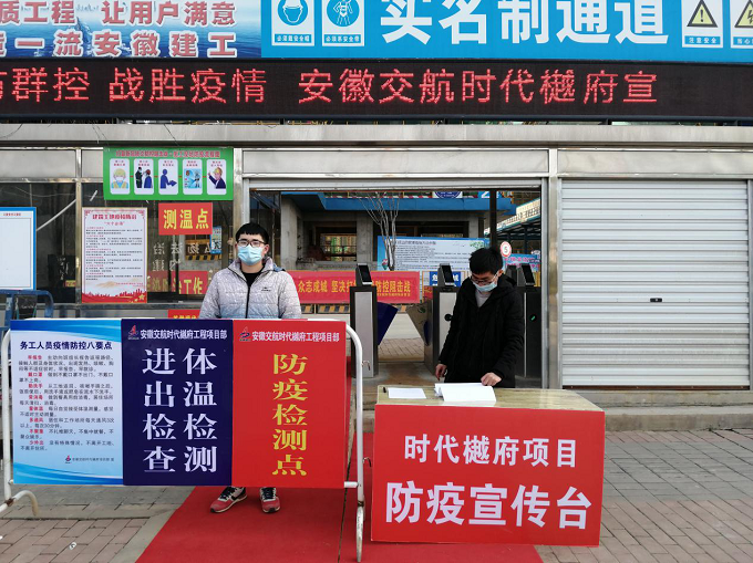 “抗疫”之时,时代樾府项目积极贯彻落实中央、省委、省国资委、集团党委及公司党委关于疫情防控和复工复产的部署安排,采取诸多有效措施做到“防疫、复工复产两手抓”,于2020年2月24日正式复工。坚定党委领导、党员带头模范、强化宣教阵地、体现国企担当。在集团党委及公司党委的领导下,项目部在做好防疫工作的同时积极推进复工复产工作。党员干部冲锋在前,切实做到“四带头”,充分发挥党员干部的带头作用,调动职工群众抗疫的积极性。做好疫情宣传工作,项目已制作宣传条幅30个、宣传牌45个、宣传册300册,并有3个扩音器循环播放“疫情防护知识”,“带头抗疫、共同抗疫”是最大的宣传。