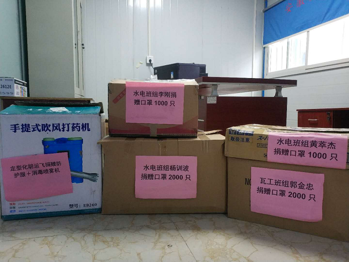 其中,李刚水电班组(2000只口罩)、黄萃杰水电班组(1000只口罩)、杨训波水电班组(1000只口罩)、郭金忠瓦工班组(2000只口罩),振达架业(5000只捐赠公司)、胡运飞定型化班组(防护服+消毒喷雾机)积极行动,通过多种渠道、采取各种措施,筹集到一次性医疗口罩共11000只、防护服1套、消毒喷雾机一台,并第一时间送往时代樾府项目部,助力项目部打赢新冠肺炎疫情防控阻击战。项目经理田龙表示将会将这批物资合理分配到工人手上。班组长们表示会在危急时刻和项目部一起同进退,大家一起“守望相助,共克难关”。