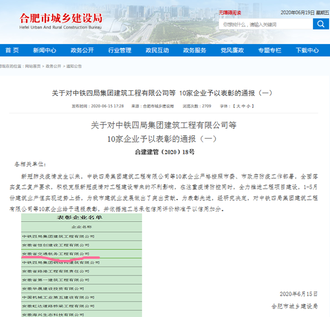 日前,合肥市城乡建设局网站公布了《关于对安徽交通航务工程有限公司等10家企业予以表彰的通报》,安徽交航公司因在疫情防控和复工复产方面的突出表现获得通报表彰,并依据施工总承包信用评价标准予以信用加分。据了解,全市仅10家建筑业企业获评。