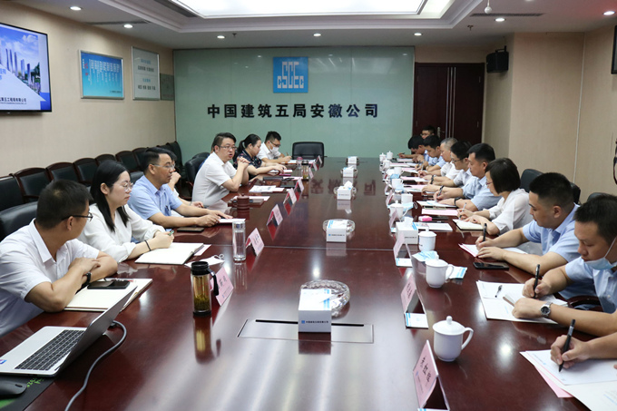 会上,双方相关职能部门负责人分别就各自负责的领域进行了深入友好交流。考察期间,公司考察组在中建五局安徽公司副总经理、总工程师陈洪根陪同下实地参观了中建五局安徽公司承建的合肥市产融中心2#、3#地块项目。