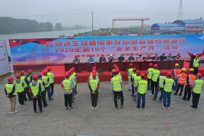 针对工地有可能发生的安全事故,此次安全演练共有应急逃生急救与触电急救两方面内容,演练的主要内容有围堰基坑涌水逃生,以及触电、伤员急救。项目部从方案制定、人员安排、器材准备、现场管理等方面出发,项目部以及各施工班组均派遣管理人员和工人参与演练,并邀请利辛县交通局、海事局、水利局、项目公司、监理单位前来观摩。此次应急演练取得圆满成功,得到现场观摩单位的一致好评。