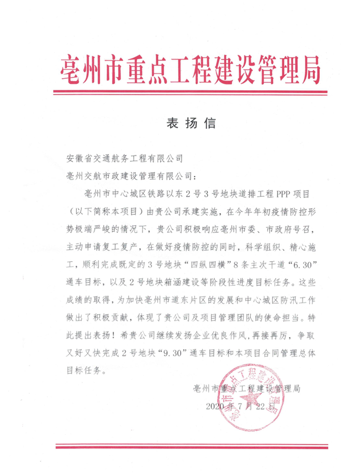 信中高度表扬了在今年年初疫情防控形势极端严峻的情况下,安徽交航公司积极响应亳州市委、市政府的号召,主动申请复工复产,在做好疫情防控的同时,科学组织、精心施工,顺利完成了既定的3号地块“四纵四横”8条主干道“6.30”通车目标,以及2号地块箱涵建设等阶段性的进度目标任务,充分彰显了国企的使命与担当。同时,信中希望安徽交航公司继续发扬企业优良作风,再接再厉,争取又好又快的完成2号地块“9.30”通车目标和本项目合同管理总体目标任务。