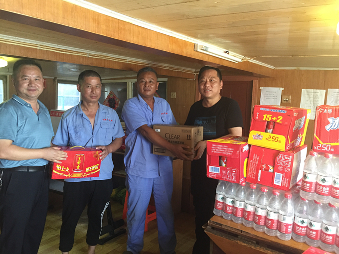 防汛抢险工作尚未结束,三伏天的骄阳炙烤着大地,工程船开启了“铁板烧”模式。8月6日,公司党委委员、总经理助理董双武一行冒着高温酷暑来到皖蛟龙号船队,亲切看望慰问坚守一线的船员们,并为他们带来了饮料、毛巾以及藿香正气水等防暑降温物品。