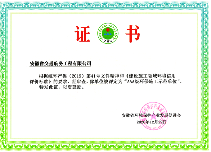 近日,经安徽省环境保护产业发展促进会评估,安徽交航公司再次荣获“AAA级环保施工示范单位”称号。