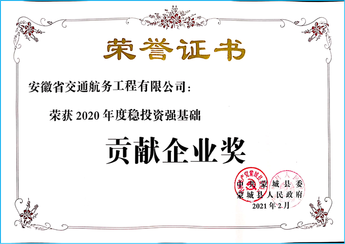 近日,从蒙城县政府网站获悉,蒙城县2020年度综合考评结果正式出炉,安徽交航公司因投资建设的蒙城县文教及客运枢纽站建设项目包PPP项目,在全县综合考核评比中成绩优异,被蒙城县委、县政府授予“2020年度稳投资强基础贡献企业奖”称号。这是公司继去年获评该奖项后又一次获此殊荣。