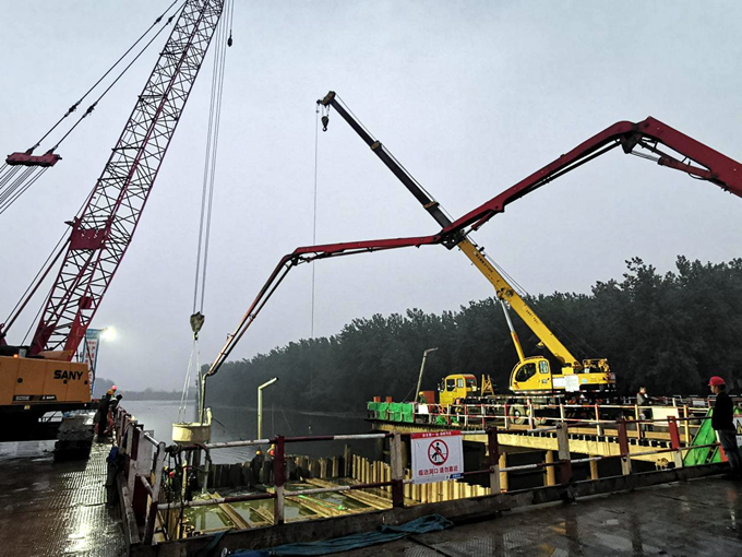 施工中,项目部结合围堰自身结构特点,通过优化封底混凝土配合比,合理布设导管、测点、规划天泵占位及混凝土罐车运送线路,最终确保了围堰顺利完成封底。同时,采用“钢板桩围堰”施工技术,既有利于节省施工工期,又使施工质量、安全能够可控。