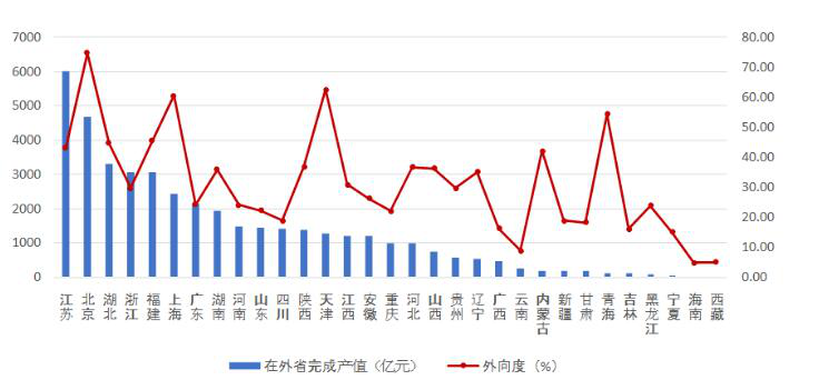 从外向度(即本地区在外省完成的产值占本地区建筑业总产值的比例)来看,排在前三位的地区是北京、天津和上海,分别为74.76%、62.56%、60.44%。此外,外向度超过30%的还有青海、福建、湖北、江苏、内蒙古、陕西、河北、山西、湖南、辽宁、江西、福建、广东等13个地区(图4)。