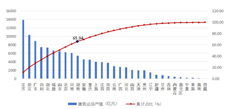 除江苏、浙江外,总产值超过5000亿元的还有广东、四川、湖北、福建、山东、北京、河南、湖南8个地区,上述10省市完成的建筑业总产值占全国建筑业总产值的65.94%(图1)。