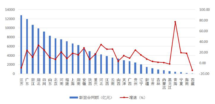 签合同额均超过10000亿元,分别为12763.52亿元、11925.7亿元、10702.53亿元。此外,新签合同额超过6000亿元的还有湖北、四川、山东、北京、河南、福建、上海、湖南等8个地区(图3)。新签合同额同比增长最快的是青海,达到77.15%。此外,河北、湖北、安徽、云南、江西、四川、贵州、广东、河南等9个地区的增幅均超过20%。西藏、江苏、黑龙江3个地区新签合同额出现负增长,其中西藏的负增长超过了10%。