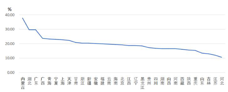 从各地区建筑业总产值增长情况看,所有地区的建筑业总产值较上年同期都有不同幅度的增长。其中,内蒙古的增幅最大,达到了37.93%。此外,湖北、广东、广西、青海、宁夏、上海、天津、甘肃、浙江、新疆、安徽等11个地区的增幅均超过20%(图2)。