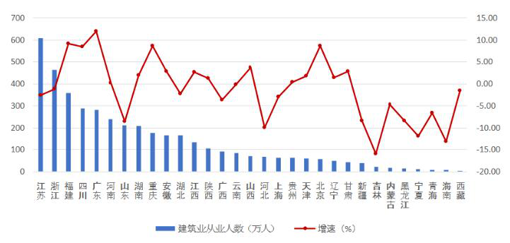 2021年上半年,全国建筑业从业人数超过百万的地区共13个。江苏、浙江依然是从业人数大省,人数分别为608.55万人和464.95万人。此外,福建、四川、广东、河南、山东、湖南等6地区从业人数均超过200万人。