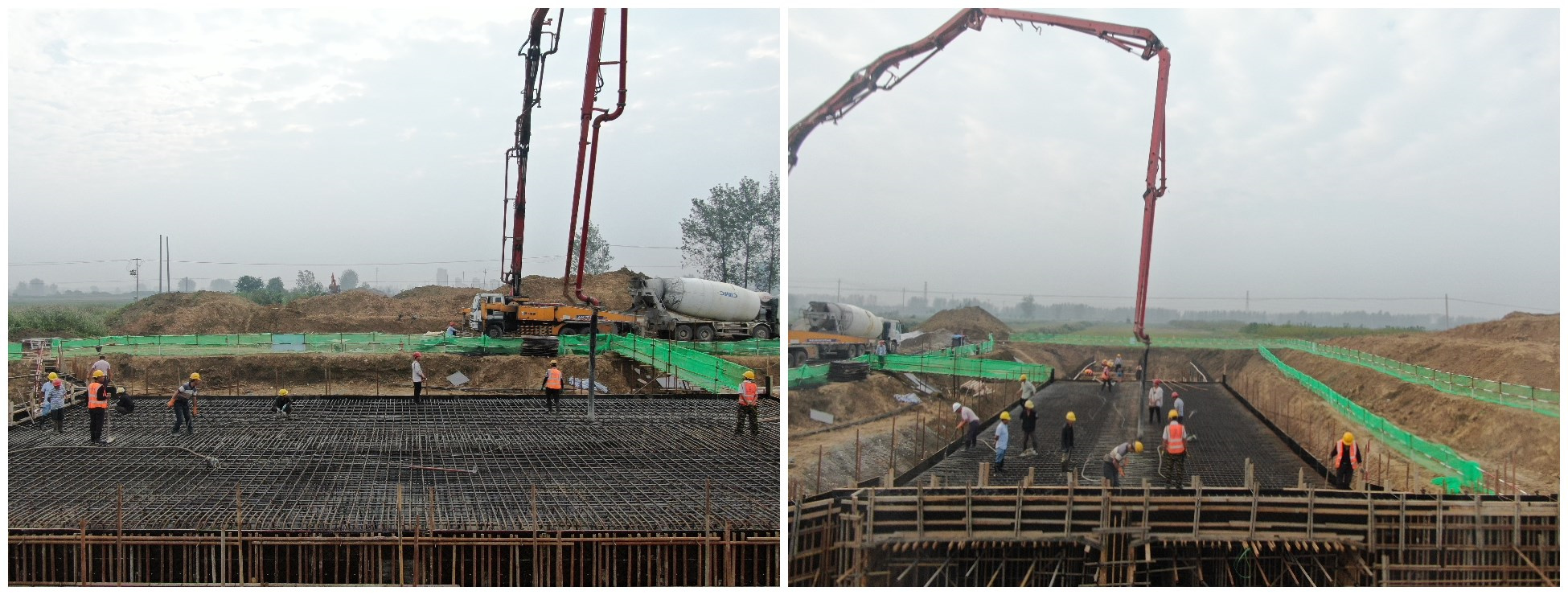 自仪式启动以来,为快速掀起大干快干热潮,确保年底完成既定进度产值,泗县长三角产业园项目紧紧围绕项目年度生产任务,秉持“工期就是效益”的理念,主动对标长三角一体化发展城乡建设示范性劳动和技能竞赛,充分发挥主人翁精神和主力军作用,确保项目工期、产值等各项任务圆满实现。今年9月9日,在炎热高温天气下,泗县长三角产业园项目龙河路箱涵,在超长雨季间歇期完成的底板混凝土浇筑、顶板及侧墙钢筋绑扎、模板支设,经过监理单位验收合格,终于迎来了顶板及侧墙混凝土的浇筑。由于混凝土浇筑方量大,项目部提前向商混站报备所需泵车、混凝土标号、方量,预计浇筑时间等计划。9日清晨6点钟,项目部技术管理人员到达磅房和施工位置,指挥泵车过磅,安排工人测温及班前培训。在施工过程中,项目部技术管理人员时刻与工人一起,送药送水,极大地鼓舞了广大工人的生产热情,经过八个小时连续奋战,浇筑任务圆满完成。