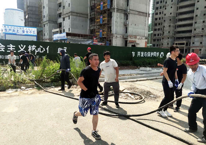 当日上午9:30,项目部全体党员及管理人员顶着炎炎烈日,将电缆从施工现场铺设至劳务工人生活区,全长两百余米。电缆如同一条游龙,在大家的手中缓缓移动。“一二三、一二三”响亮的口号声不断响起,大家团结一致,一米一米将电缆向指定的位置拉移。在30多度的高温天气下,在项目部全体员工的共同努力下,经过1个多小时的奋战,终于顺利完成电缆铺设任务,保障了劳务工人的生活供电。