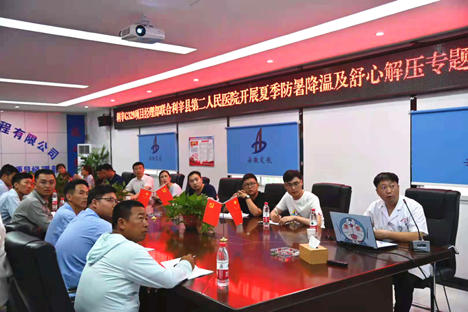 培训环节,项目部特邀利辛县第二人民医院杨文成医生,就开展夏季防暑降温及舒心解压知识进行了专题讲座。杨文成医生,先是就中暑的原因、发病机理做一个简单讲解,然后针对以上原因、如何预防以及应急方式做了一个细致说明。