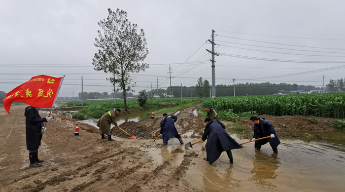 7月17日夜,大雨滂沱,安徽交航利辛县S338改建工程K13+800-K15+4200新建路基两侧积水严重。发现积水严重问题后,项目党支部于7月18日早8:30立即召集S338利辛项目部党员先锋队、青年突击队集体出动,积极开展防汛排涝工作。