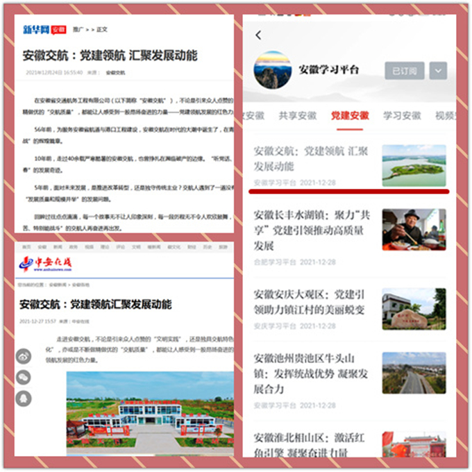 近日,新华社(新华网)、学习强国、中安在线等中央及省级主流媒体,纷纷聚焦安徽交航党建工作,集中报道了十九大以来安徽交航深入学习贯彻习近平新时代中国特色社会主义思想,坚持和加强党的领导,推进全面从严治党及以党建领航高质量发展等方面取得的一系列成果。